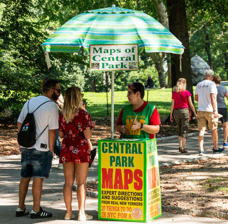 Central Park, New York, USA - 14 August 2018: Tourist asking questions to a women who is selling maps of central park on a summer afternoon.