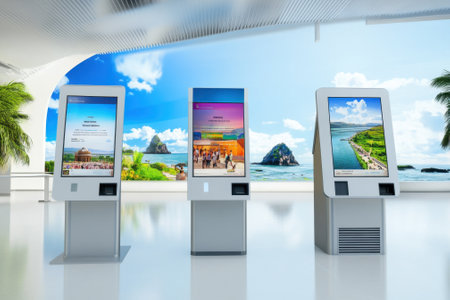 Travelers engage with digital kiosks showcasing stunning destinations on a sunny day in an airport.