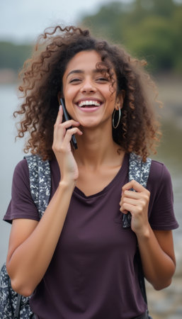A cheerful young woman with curly hair smiles brightly while chatting on her phone, wearing a casual outfit and a stylish backpack. The serene water backdrop enhances the joyful atmosphere, capturing a moment of connection and happiness.