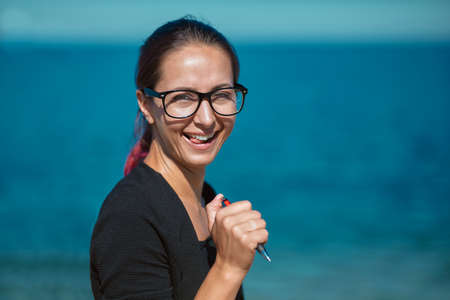 Cute lady in glasses holding pen. Ready for work on holiday. Sea view on background. Remote office and travel time idea