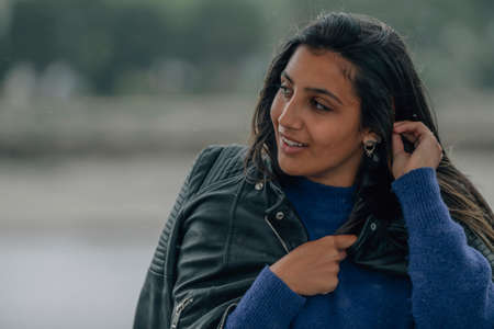 Beautiful brunette woman resting by the lake, wearing brown leather jacket