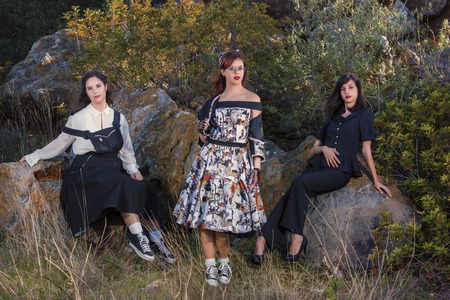 Group of three girls posing in nature with vintage clothing.