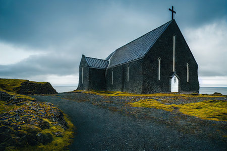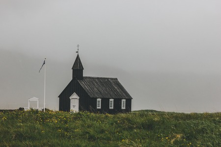 dramatic shot of Budir church on green field at Snaefellsnes, Iceland