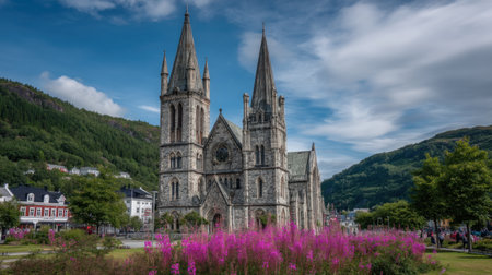 Full outdoor shot of a stone cathedral in a town, with surrounding lush green hills and a vibrant pink flower garden in front of the building.