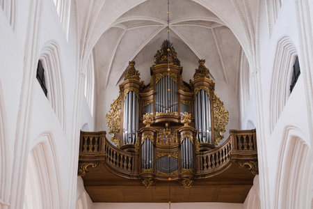 Hallgrimskirkja church indoor interior. Beautiful big arch view. Organ musician instrument. Symmetry modern high hall. Place for the praying.