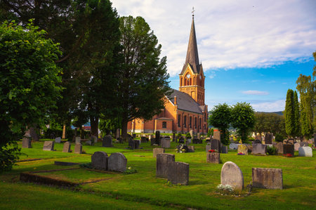 Brick church with tall steeple surrounded by a green cemetery and trees in Lillehammer, Norway. It is also known as Lillehammer kirke.