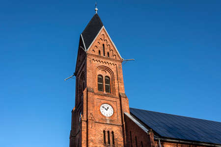 Germany, Greifswald, Wieck - December 30, 2016: Steeple of local neo-Romanesque church (Bugenhagenkirche) of the small fishing village.