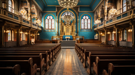 Sunlight pours through intricate stained glass windows, filling the beautiful church interior with an enchanting glow. The majestic space.