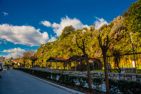 MARMARIS, TURKEY: The Archaeological Park of Iuilik or the Rocks of Well-Being is a unique open-air museum located on a hillside in the center of Marmaris on a blue sky background on a sunny day.