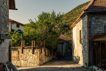 Narrow rural street with stone houses and tiled roofs in soft morning light, located in Mtskheta, Georgia. Traditional architecture with a mountain backdrop and peaceful vibe