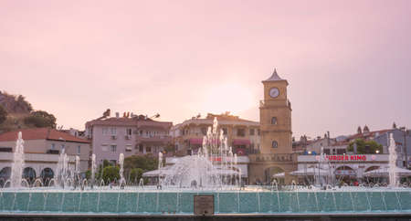Turkey, Marmaris - June 20, 2019. Fountain and clock tower in the center of Marmaris at sunset, Turkey