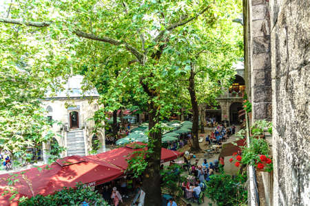 Koza Han tea gardens and mosque in Koza Han Silk Bazaar. Koza Han is historical place from Ottoman times in Bursa, Turkey