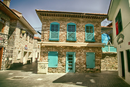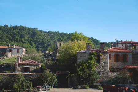 Tradional streets and Typical Aegean Architecture of Adatepe Village in ida Mountains at Sunny Day, Canakkale, Turkey.