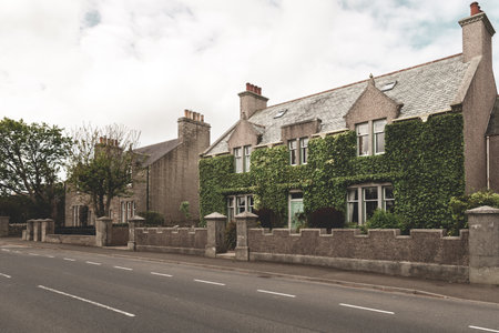 Old overgrown house at Kirkwall, Scotland with road in front during cloudy day