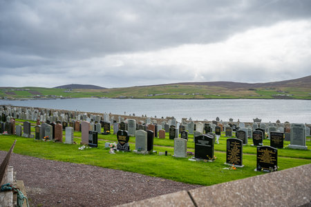 Graveyard Cemetery on Shetland Island on a hill with sea in the background during cloudy day