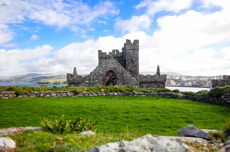 The remains of Peel castle on top of the hill constructed by Vikings in Peel city in the Isle of Man