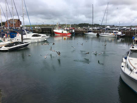 Howth, Ireland - January 1, 2020: Fishing ships in the small trading port of Howth, fishing village near Dublin, Ireland