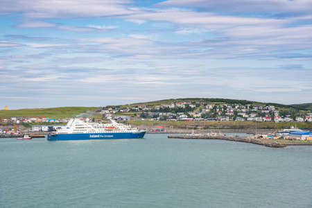 Husavik Iceland - July 15. 2021: Cruise ship ocean Diamond entering port of town of Husavik