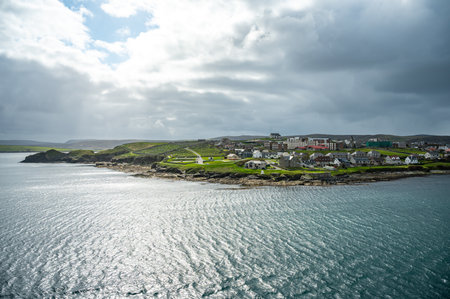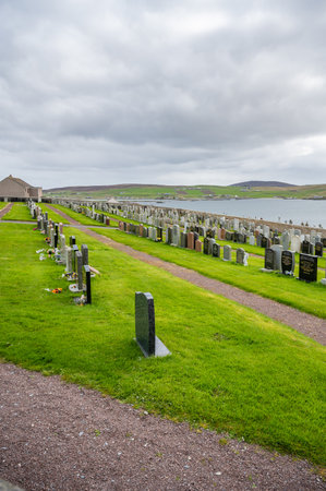 Shetland Islands cityscape and old graveyard with sea in front, wide angle shot, view from the distance, Scotland