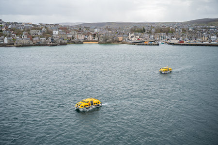 Two yellow lifeboats driving back to AIDA Bella cruise ship, Port of Shetland Island in the background, Scotland