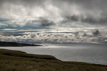 Landscape off the island of Grimsey in the north of Iceland beyond the Arctic Circle. The ocean is an icy clear blue, the sky a little cloudy and many rocks on below the cliffs