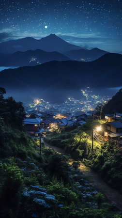 Generative AI : Beautiful Tonglu a small hill station in Darjeeling at night time with sky and stars