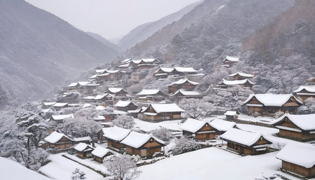 A picturesque Japanese village with traditional houses nestled amongst mountains at sunset.