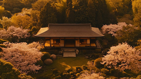 A tranquil Japanese garden featuring a traditional house surrounded by stunning cherry blossoms, capturing the beauty of nature at sunset.