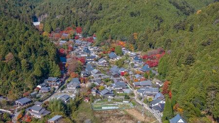 JAPAN - October 21, 2019 : Beautiful aerial view of the world heritage site, Shirakawa-go in autumn season