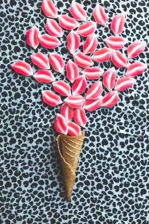 candy mouth and lips with ice cream cone on dark background trendy, minimalist set design, summer theme