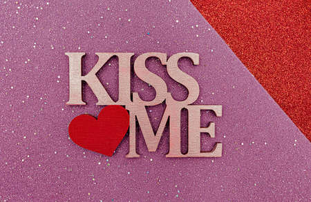 Wooden lettering KISS ME with heart on felt glittering background.