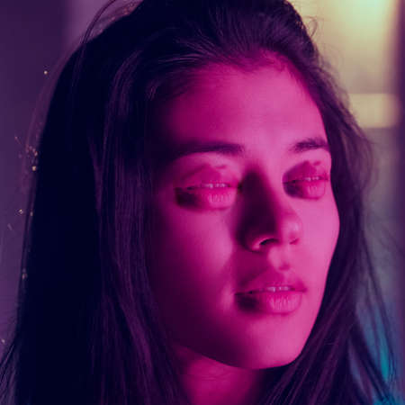 Close up portrait of beautiful young Asian woman face on pink background.