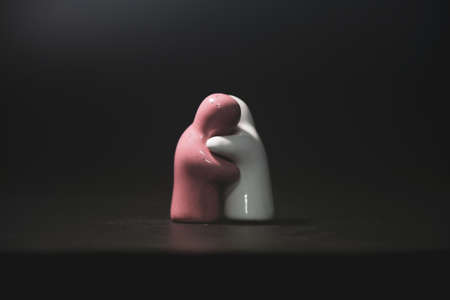 Terracotta lovers hugging each other on a black background. love concept and concern