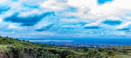 View of the valleys and mountains in Costa Rica form the mountains near Santa Ana with clouds and fog at the distance.