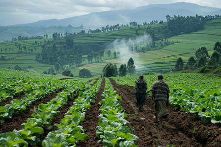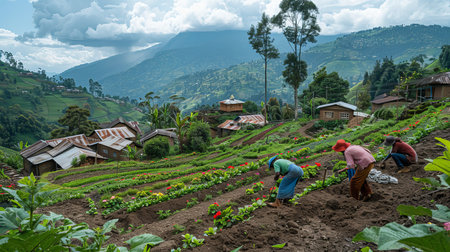 Rwandan farmers dedicate long hours in beautiful terraced fields, cultivating vibrant crops amidst stunning mountains, showcasing natures beauty and their commitment to sustainable agriculture