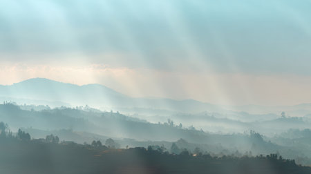 A serene landscape showcasing rolling hills enveloped in mist with soft rays of light streaming through clouds, creating an ethereal atmosphere perfect for nature lovers.