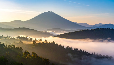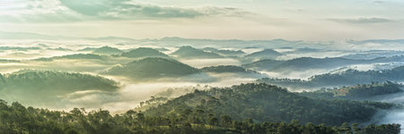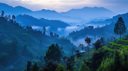 This breathtaking mountain landscape captures the serene beauty of mist-covered hills at dawn, showcasing nature's tranquility and stunning vistas.