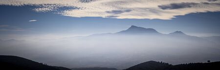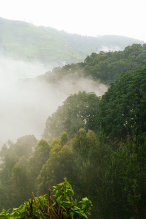 misty mountain with cloudy dramatic sky at morning from flat angle image is taken at badda peak shillong meghalaya india.