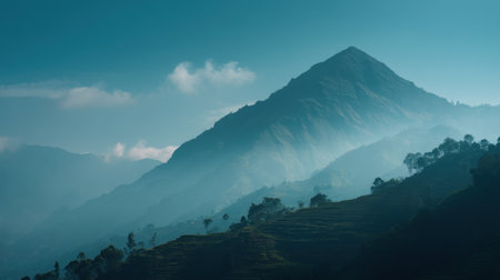 This captivating image showcases misty mountains adorned with terraced fields, creating a serene and tranquil atmosphere in the early morning light.
