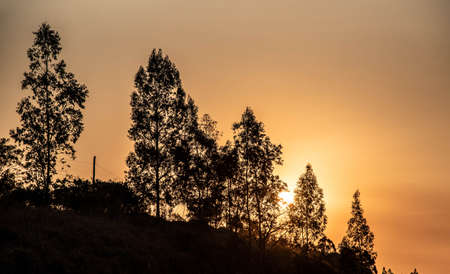 Silhouette of Eucalyptus trees. Sunset. Late afternoon in South America. Rural landscape. Feeling of peace and tranquility. Meditation. Prayer time. Phenomena of nature.