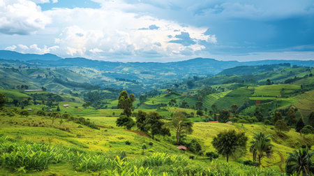 Vibrant agricultural landscape featuring lush green countryside and rolling hills