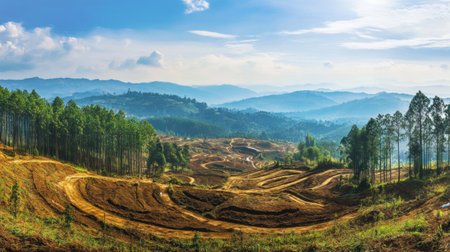 A panoramic view of a sprawling forest landscape with freshly planted trees, illustrating the positive impact of reforestation on the environment and biodiversity.
