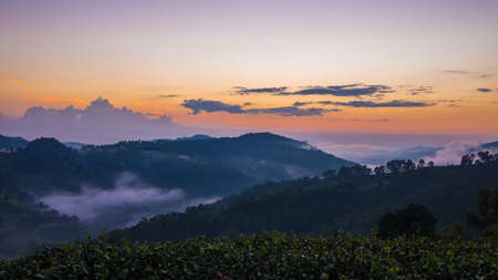 Panorama of Doi Mae Salong Mum from the viewpoint at morning is a place where many hill tribe people live and work in tea plantation in Chiang Rai, Thailand.