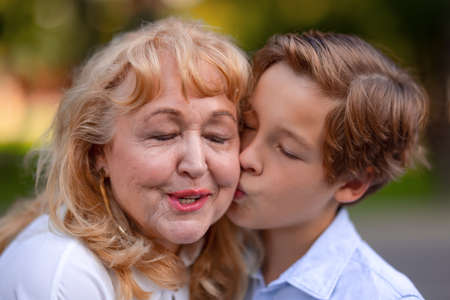 Warm close-up of girl kissing boy on cheek and hugging him in cozy knitwear on an autumn day.