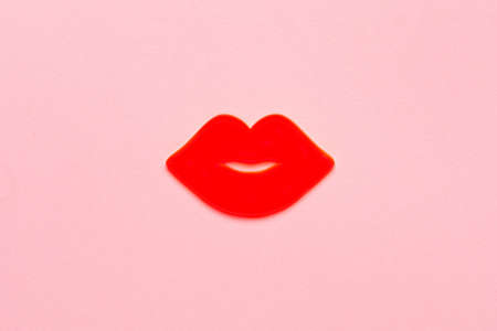 Kissing woman lips shine pink colored on paper background. Greeting card design with copy space. Close up glamour kiss object.