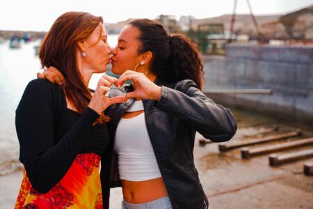 Lesbian women in love enjoying an adventure in mountains. Homosexual female couple