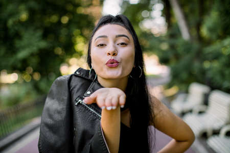 Amazing smiling Asian mixed raced model woman in black leather jacket, posing with different emotions at beautiful public park, showing air kiss to camera. Pretty woman enjoying a day at park.