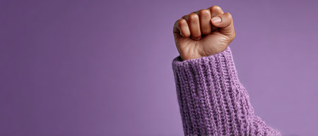 Woman's arm with a raised fist in a knitted lavender sweater against a light purple background, providing a strong visual element with copy space for design purposes