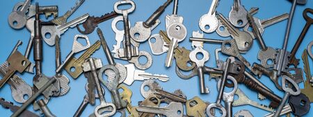 Bunch of keys for locksmith. Set of keys on blue background. Collection of antique and modern keys.