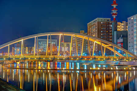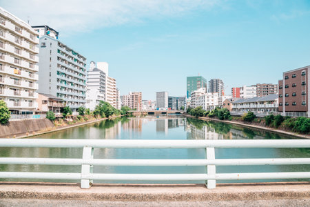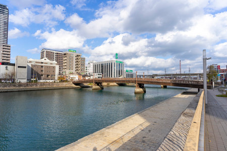 Tokiwa Bridge with blue sky across Murasaki River in Kitakyushu, Japan